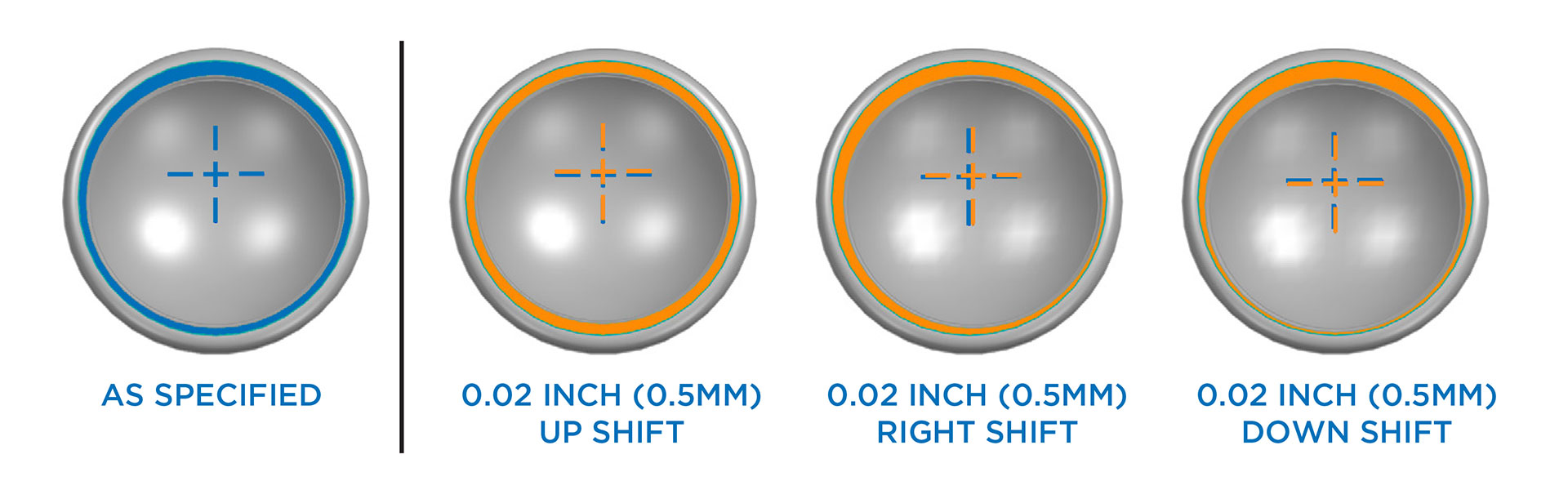La superficie del inserto humeral inverso se muestra: 1) según lo especificado y 2) con tres posibles desviaciones de fabricación del centro de rotación. El azul indica el centro de rotación especificado y el naranja indica la posición desplazada.